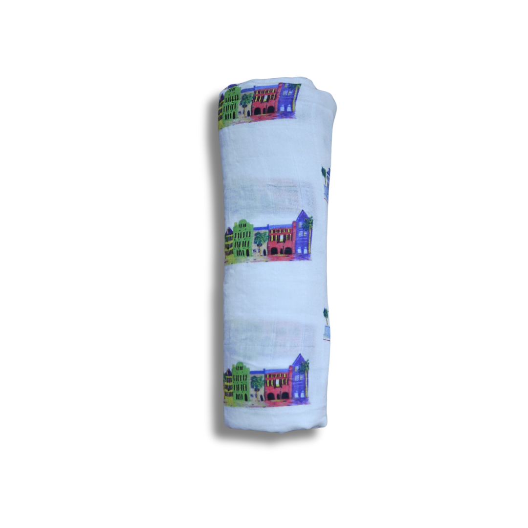 Rainbow Row Swaddle Blanket: Soft, cozy, and designed with a colorful nod to Charleston’s famous Rainbow Row, perfect for snuggling.